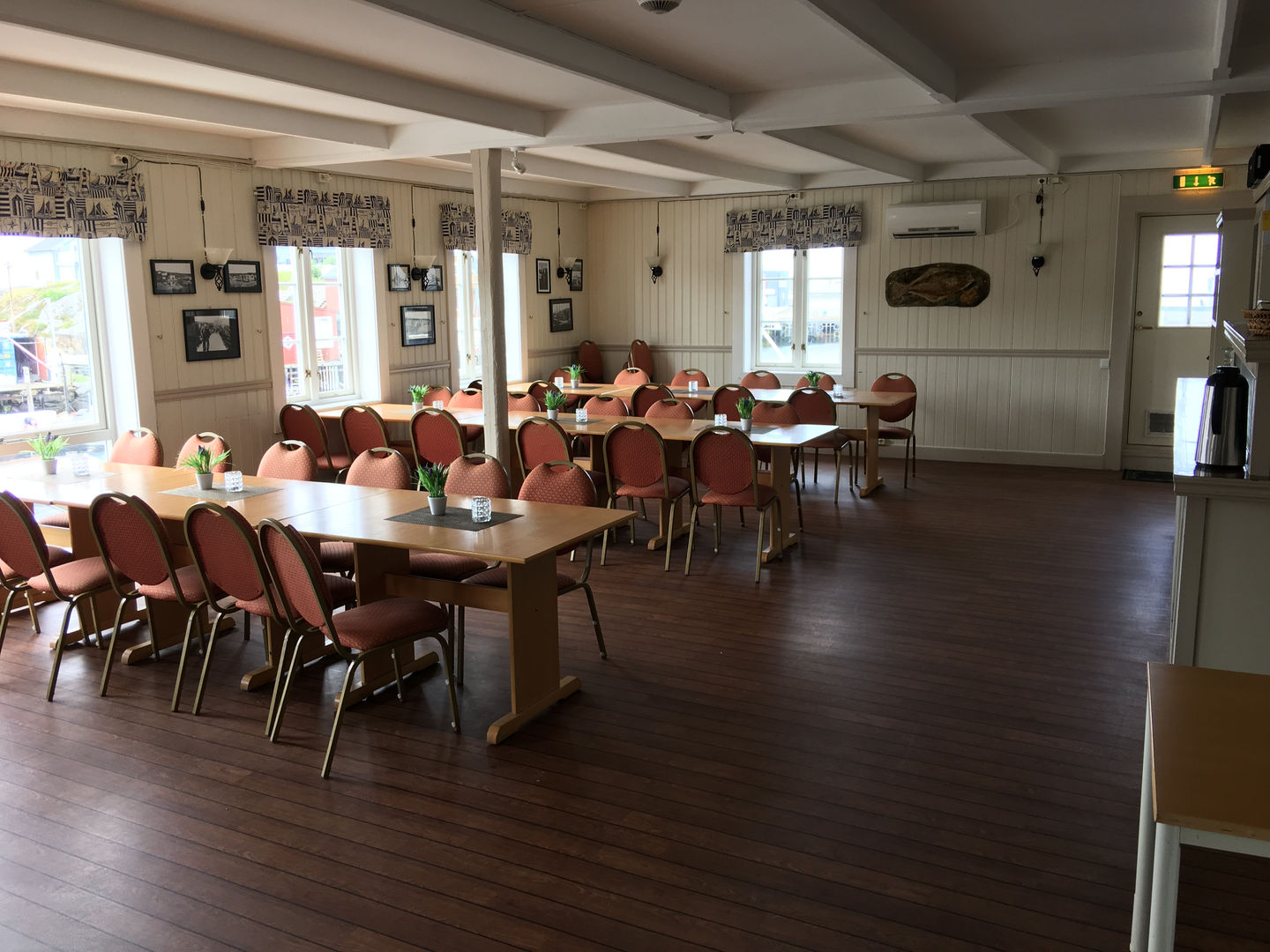 Stort areal tilgjengelig for dere til spising og sosiale aktiviteter. Sofakrok med TV i enden av rommet som ellers består av bord og stoler.